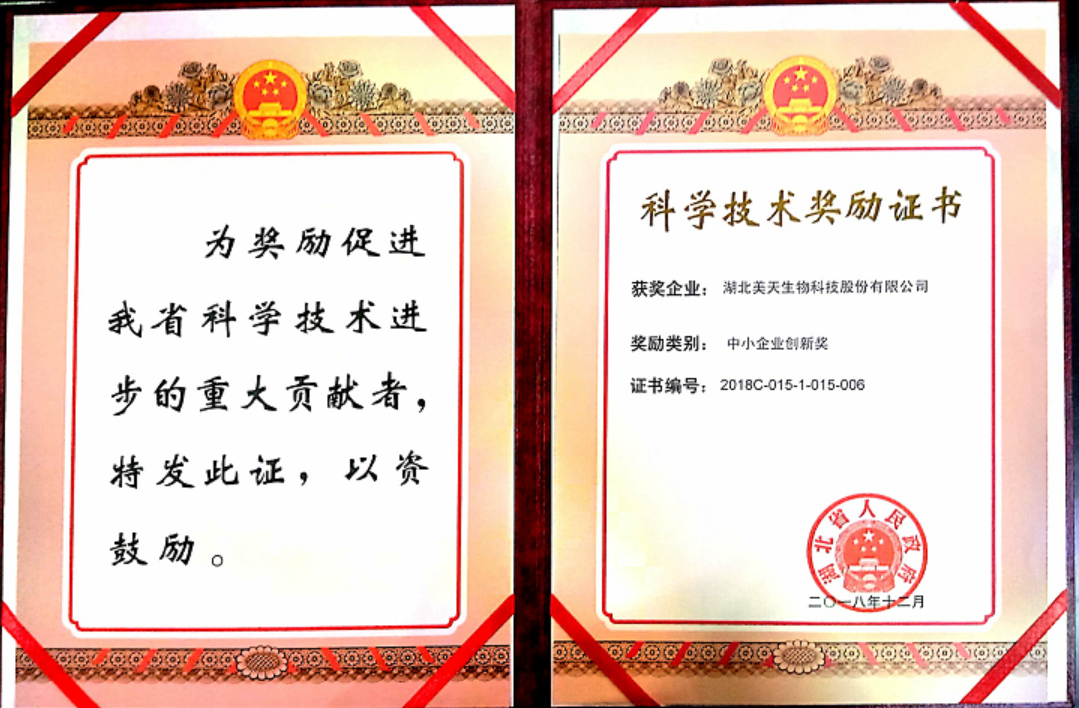 湖北省科学技术奖是奖励促进我省科学技术进步的重大贡献者,作为全省15家获得2018年度“中小企业创新奖”的企业之一,既是对我公司近年来科技创新工作的充分肯定,也是对我公司未来科技创新工作的有力促进,我们定将求真务实、开拓创新,不断提高自主创新能力,加快新产品、新技术的开发和应用,为实现美天生物的跨越式发展谱写新的篇章。